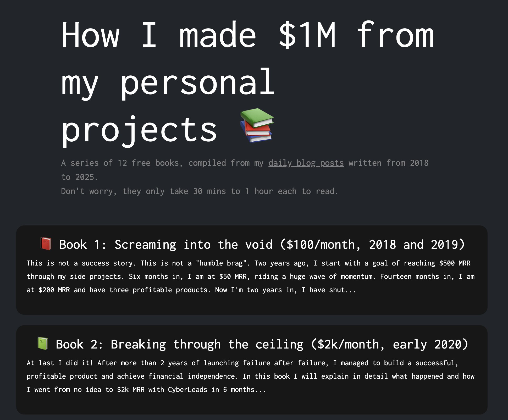 At last I did it! After more than 2 years of launching failure after failure, I managed to build a successful, profitable product and achieve financial independence. In this book I will explain in detail what happened and how I went from no idea to $2k MRR with CyberLeads in 6 months...