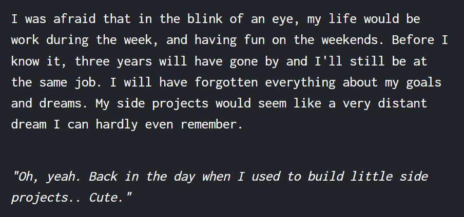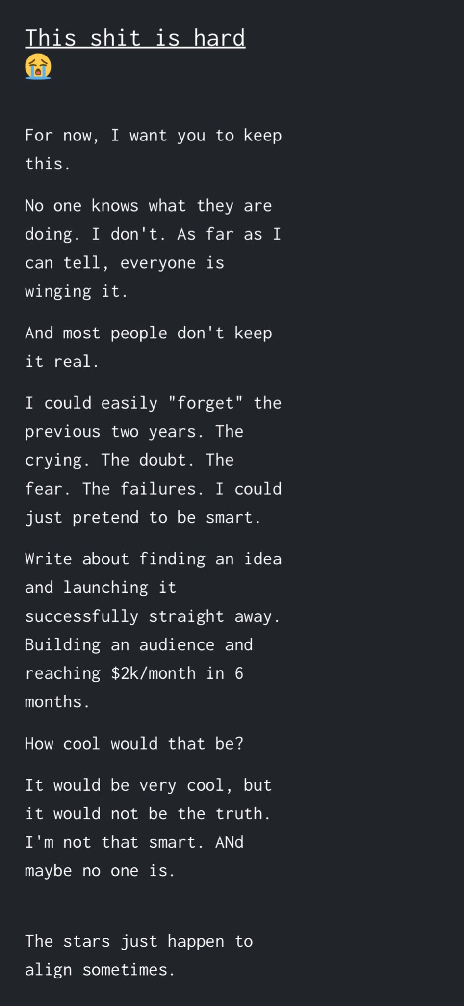 This is not a success story. This is not a "humble brag". Two years ago, I start with a goal of reaching $500 MRR through my side projects. Six months in, I am at $50 MRR, riding a huge wave of momentum. Fourteen months in, I am at $200 MRR and have three profitable products. Now I'm two years in, I have shut...