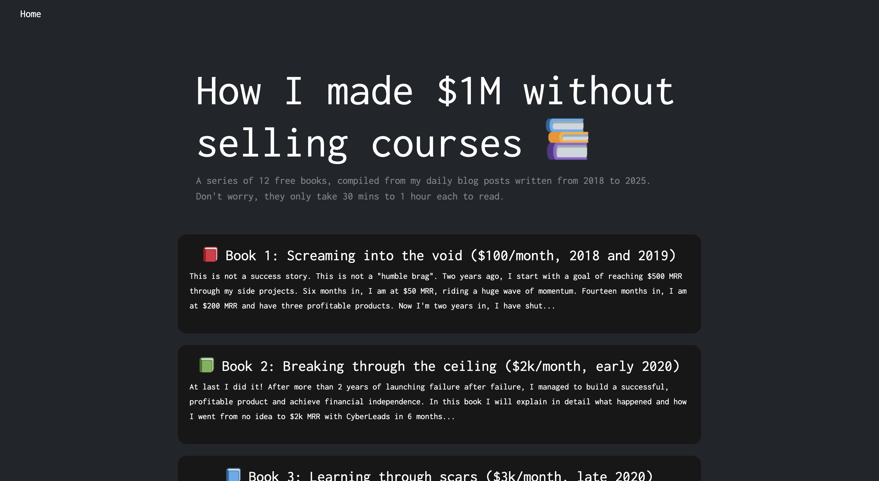 At last I did it! After more than 2 years of launching failure after failure, I managed to build a successful, profitable product and achieve financial independence. In this book I will explain in detail what happened and how I went from no idea to $2k MRR with CyberLeads in 6 months...